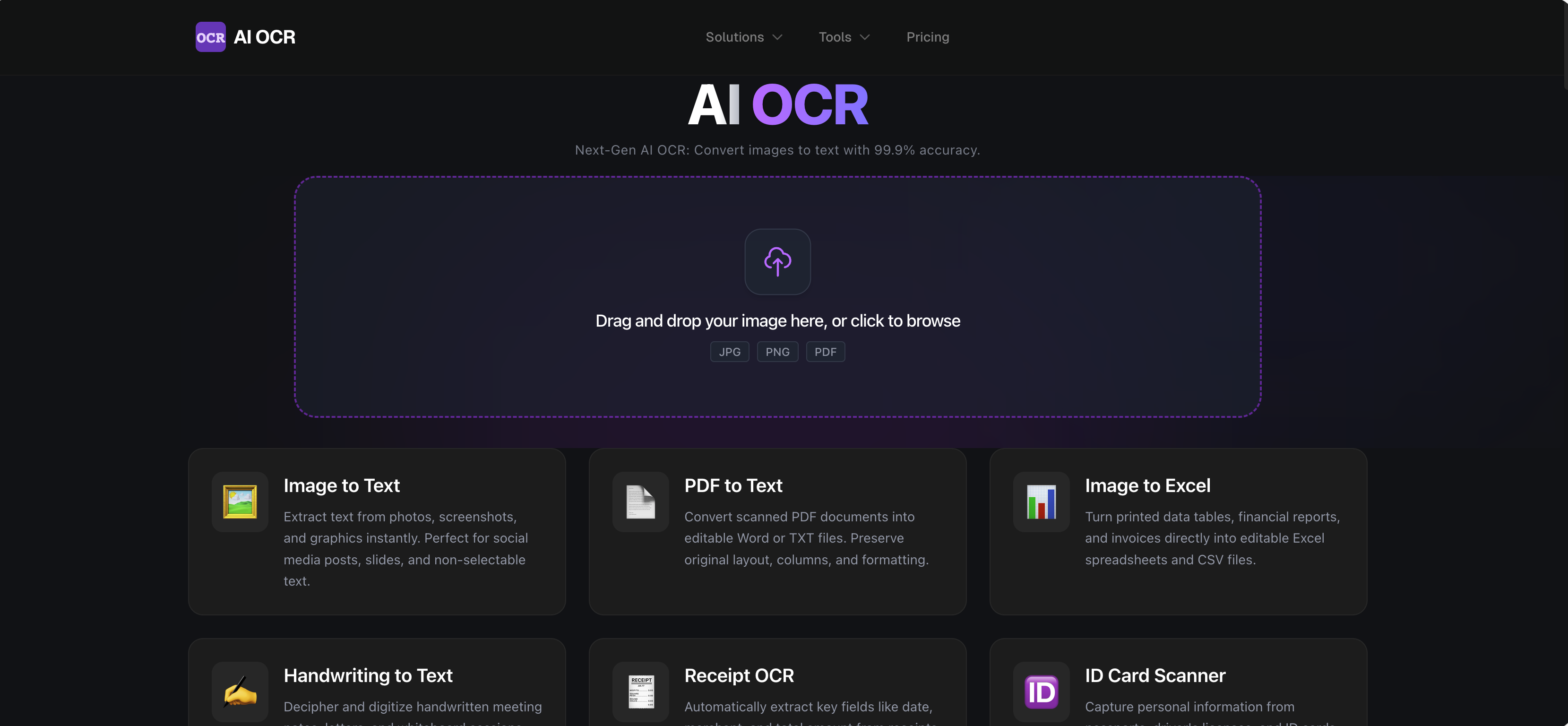 Extract text from images and PDFs with 99.9% accuracy. Supports handwriting recognition and 100+ languages. No registration required. Best free AI-powered OCR solution.