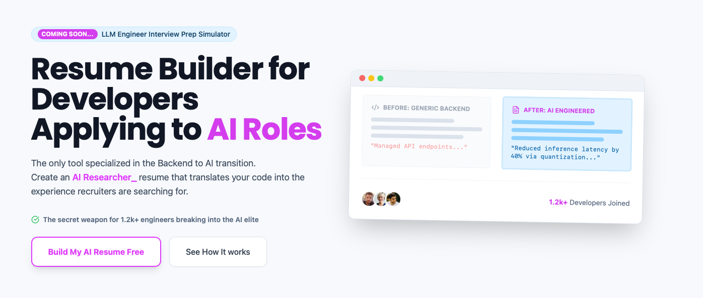 Turn your backend experience into AI/ML language that gets you interviews. 87% of users land interviews within 30 days.
