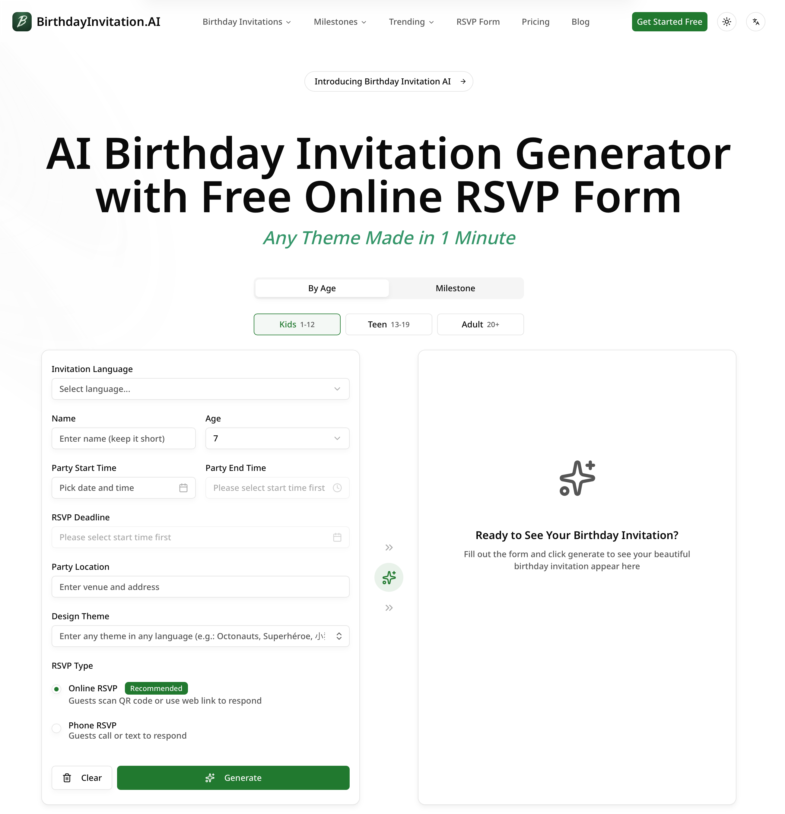Birthday Invitation AI is a complete SaaS solution for creating professional birthday invitations and managing party ...