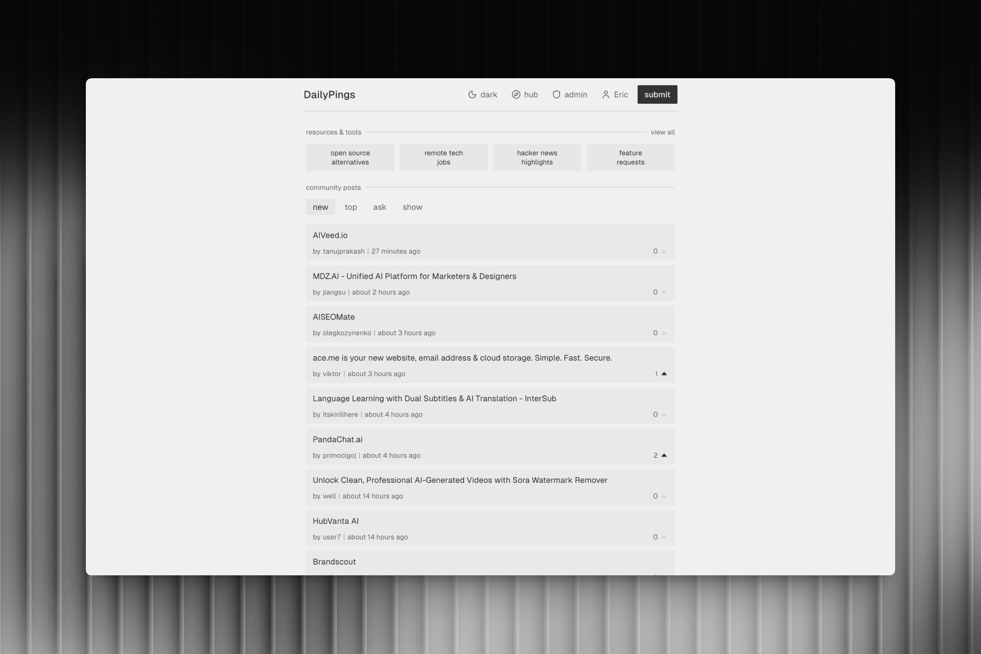 DailyPings serves as a minimal tech hub designed specifically for builders, developers, and tech enthusiasts. The platform originated as a lightweight space for users to post progress and track what others were shipping. Today, it has evolved into a comprehensive ecosystem that maintains its signature minimal aesthetic while hosting over 3,000 posts and a growing community of 2,400+ members. Core Community Features The platform facilitates high-quality interactions through several dedicated cont