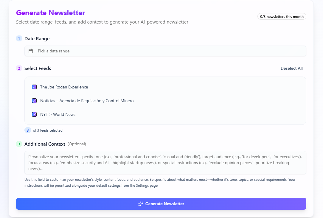 Turn RSS feeds into polished newsletters in under 2 minutes. Generate titles, subject lines, and full drafts for your email workflow.