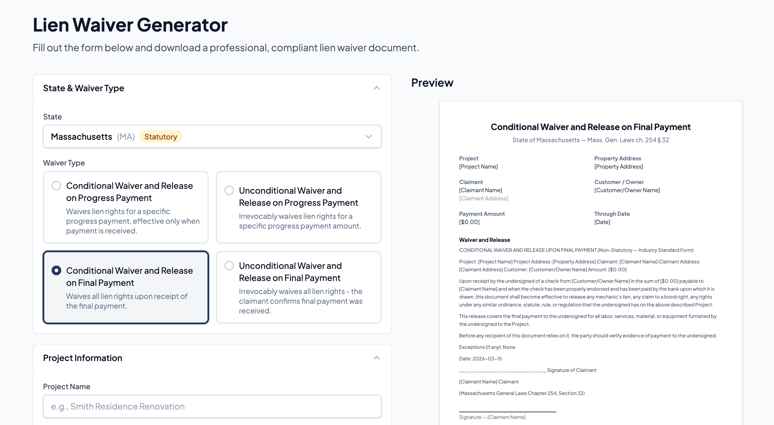 DocJoist is a specialized document generation platform designed to simplify the construction payment process. It provides a free lien waiver generator that covers all 50 states, ensuring that contractors and subcontractors can produce professional documents without the need for expensive legal fees. By using state-compliant templates, the platform helps users avoid the risks associated with non-compliant forms that could potentially void mechanics lien rights. Comprehensive Waiver Management The