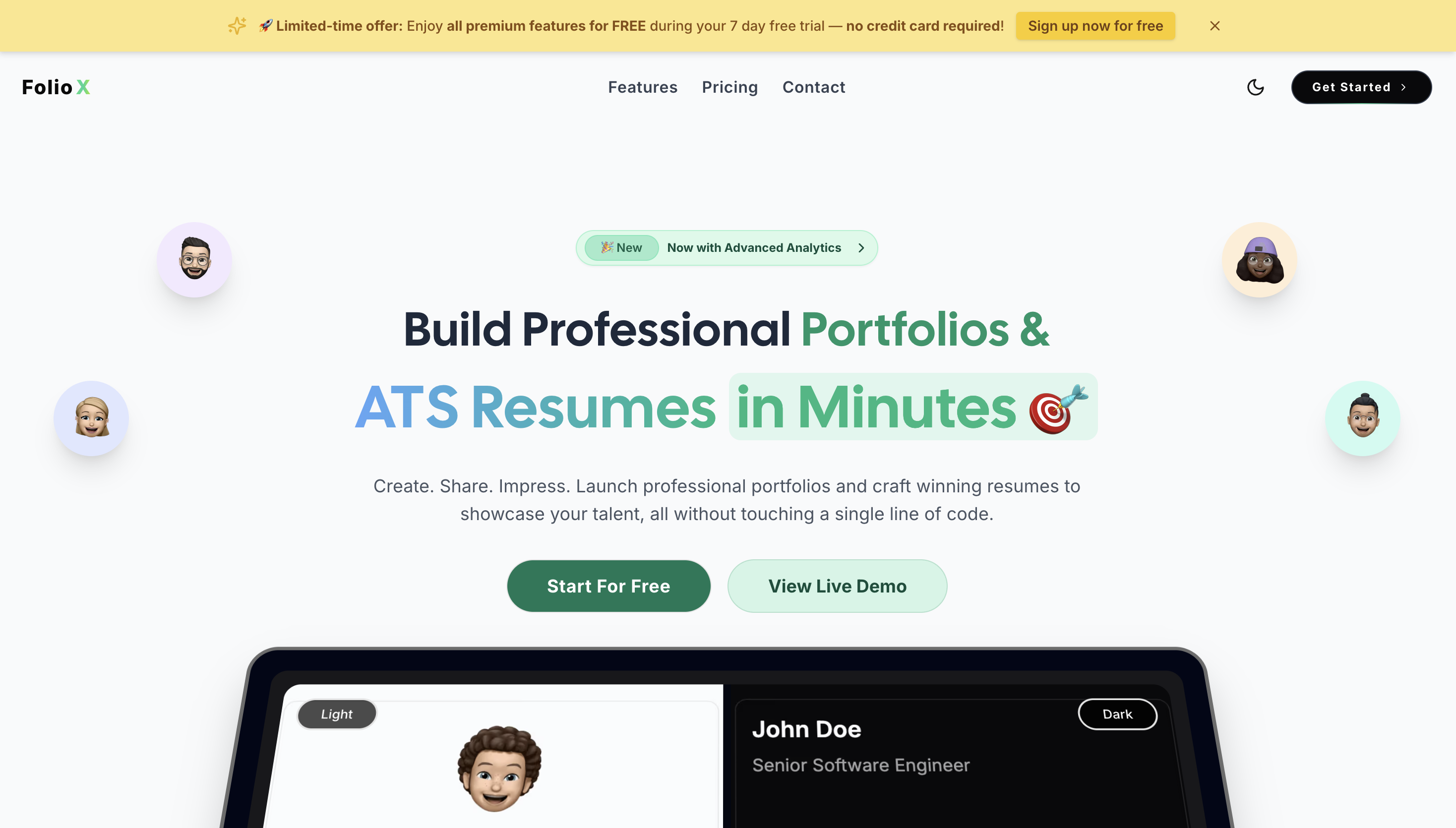 Create stunning professional portfolios and ATS-optimized resumes in minutes. Custom domains, 20+ widgets, analytics dashboard, and zero coding required. Build your digital presence with FolioX.