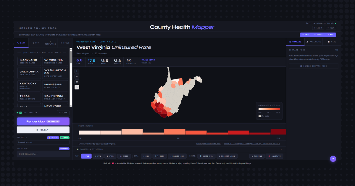 Enter county-level public health data and generate an interactive choropleth map with tooltips, legends, rankings, ex...