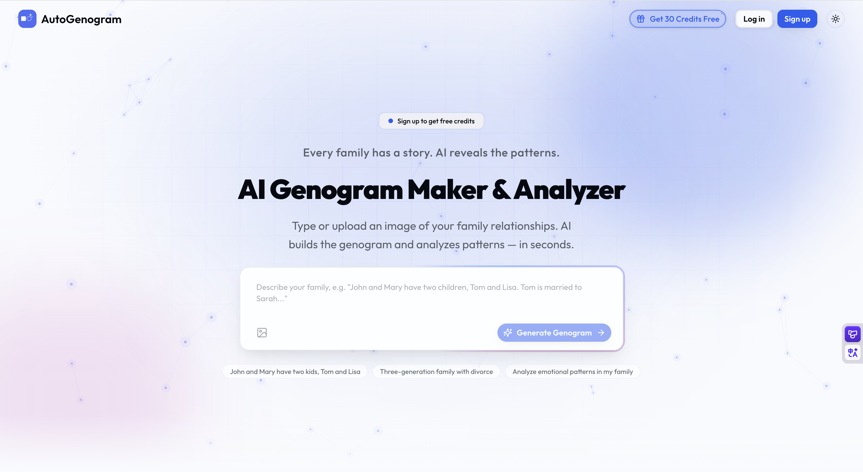 The simplest AI genogram maker for therapists, students & families. Describe relationships in text or upload an image — build, analyze, and export as PDF in seconds. Try it free.