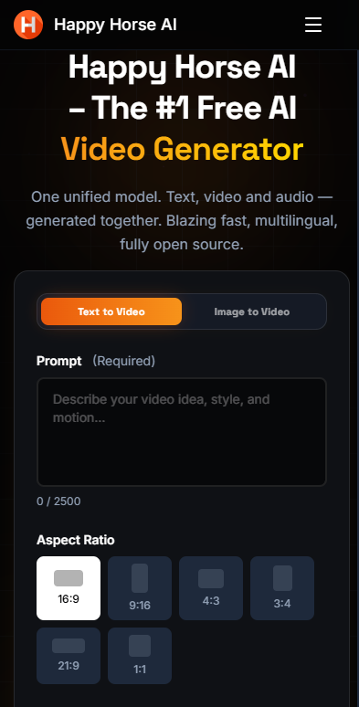 Happy Horse AI is powered by Happy Horse 1.0 — a single self-attention Transformer that jointly generates video and audio from text, replacing the multi-stream complexity of older architectures. Blazing fast, multilingual, and fully open source. Whether you start from a text prompt or a reference image, Happy Horse AI delivers state-of-the-art results at record speeds.