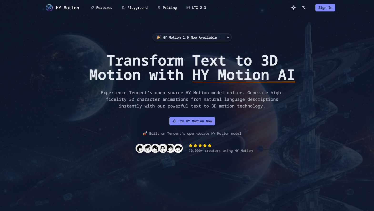 HY Motion is an online platform to generate high-fidelity 3D character animations from text descriptions. Powered by ...