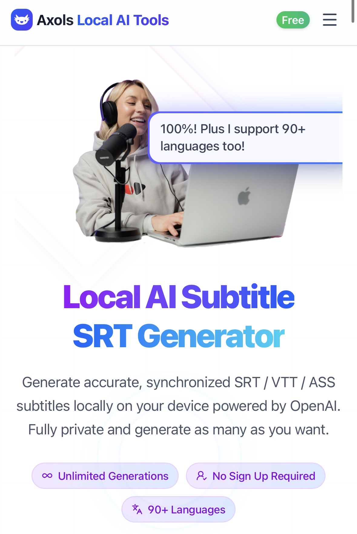 Create subtitles for YouTube videos, tutorials, podcasts & screen recordings with OpenAI Whisper models running locally. 100% private Local AI. No usage limits, no data upload, runs in your browser. 90+ languages, completely free forever.