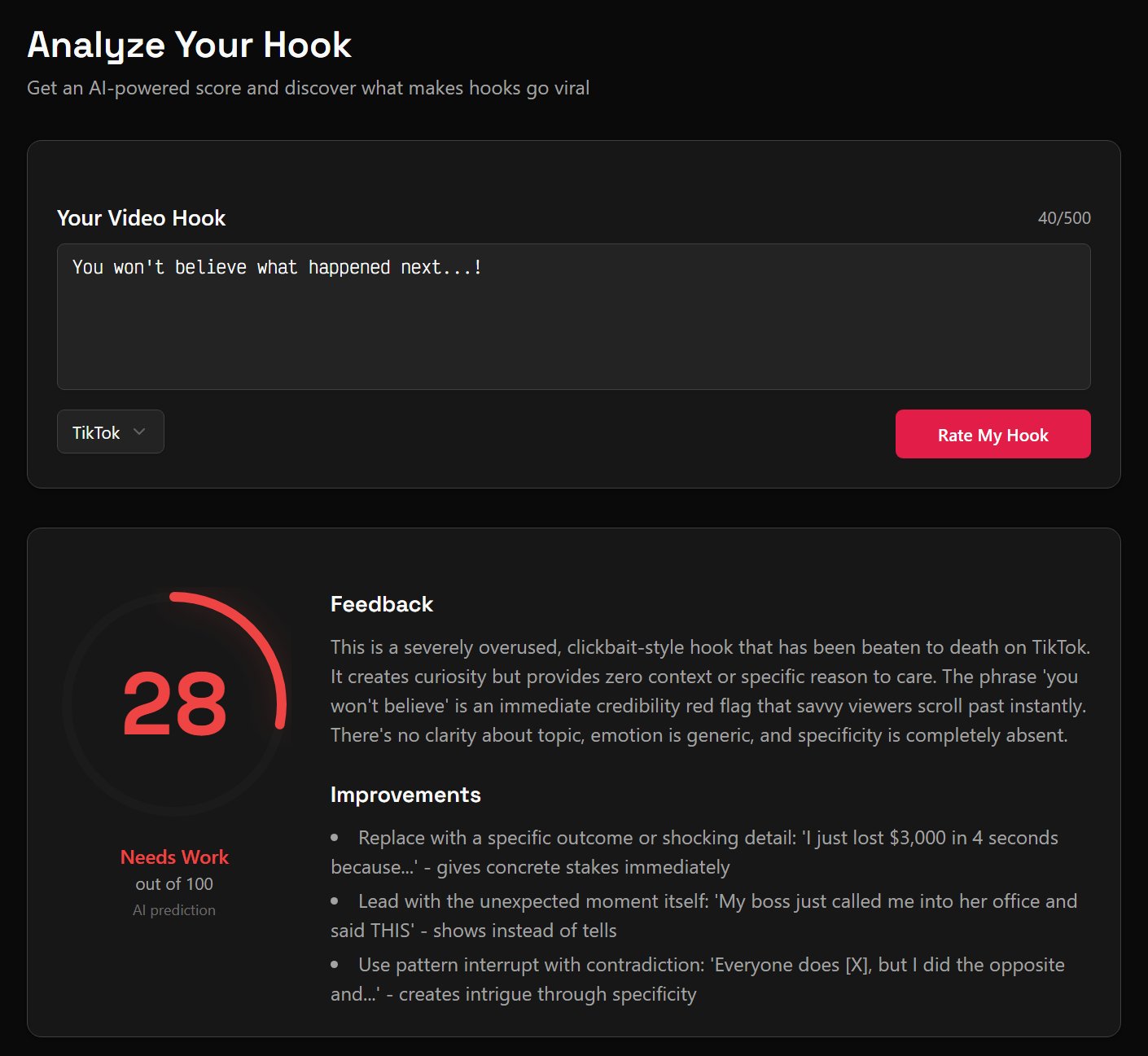 Score your video hook 1-100 and get 10 viral alternatives instantly. AI-powered hook analyzer for TikTok, Instagram R...