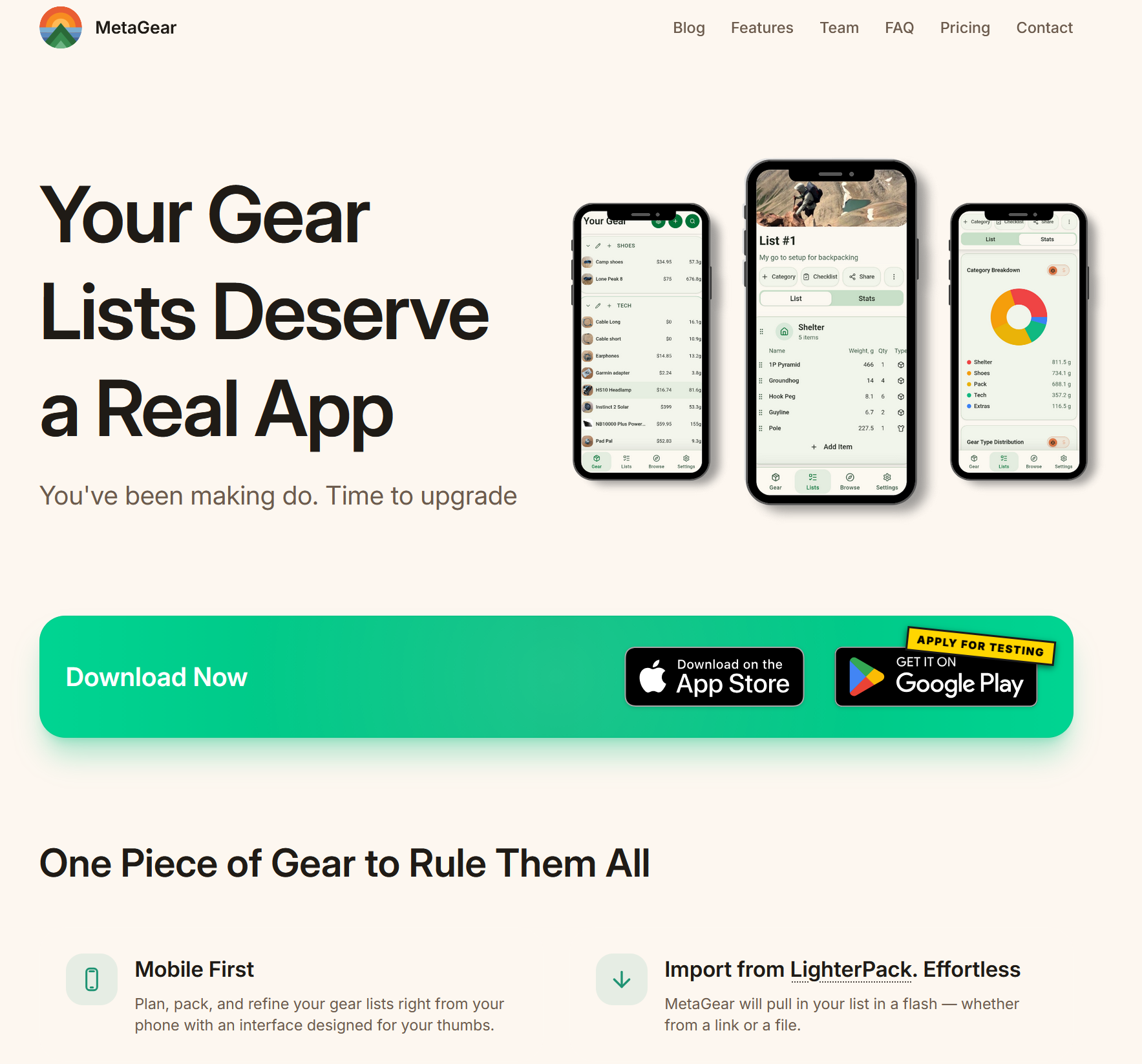 MetaGear is a modern productivity tool designed specifically for hikers and backpackers to manage their equipment. It serves as a mobile-first alternative to traditional spreadsheets, allowing users to build smarter packing kits with live weight tracking and a synchronized gear closet. The application focuses on streamlining the preparation process through an intuitive interface built by outdoor enthusiasts. Advanced Gear Management The platform features a Gear Vault where you can store all your