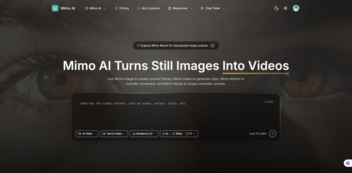 Mimo AI unites Mimo Video, Mimo Image, Mimo Motion, and Mimo Movie in one platform for AI video, AI image, motion transfer, and cinematic scene creation.