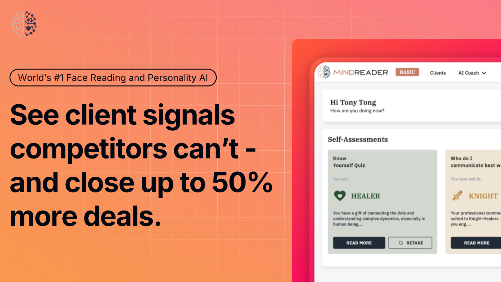 Mindreader helps sales professionals see client signals competitors can’t - and close up to 50% more deals. Powered by world-leading Face Reading and personality AI trusted by 3500+ salespeople, it helps founders, consultants and business developers avoid losing deals over a single wrong word - reducing anxiety and guesswork by instantly revealing each client’s decision style.