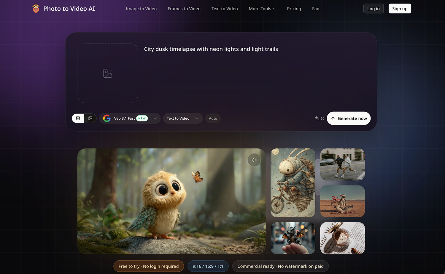 Photo to Video AI is a web-based tool that converts static images into natural-motion AI-generated videos in minutes. Users upload a JPG, PNG, or WEBP photo, write a motion prompt or choose from presets (product showcase, cinematic push, portrait motion, etc.), and receive a 5–10 second video ready for social media or commercial use. Key features include subject consistency (no face morphing or distortion), physics-based motion (realistic hair, fabric, water movement), and multi-format output (9