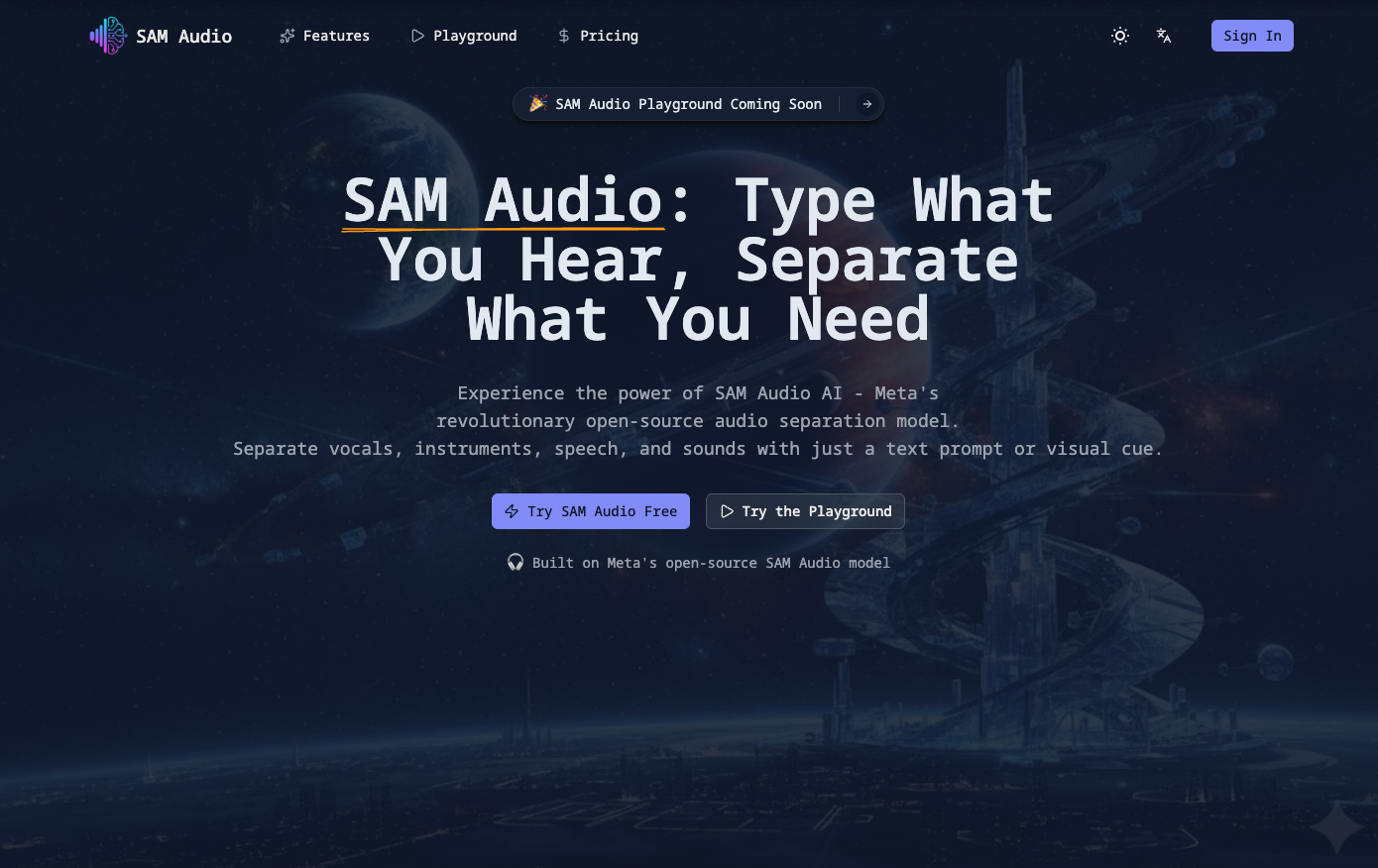 Built on Meta's open-source SAM Audio AI model. Extract vocals, isolate instruments, and remove background noise online. Try SAM Audio playground.