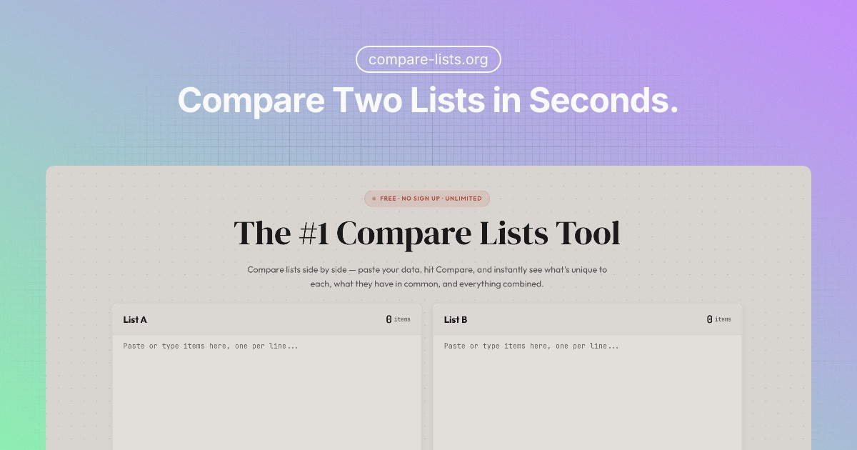 Compare lists side by side — paste your data, hit Compare, and instantly see what's unique to each, what they have in...