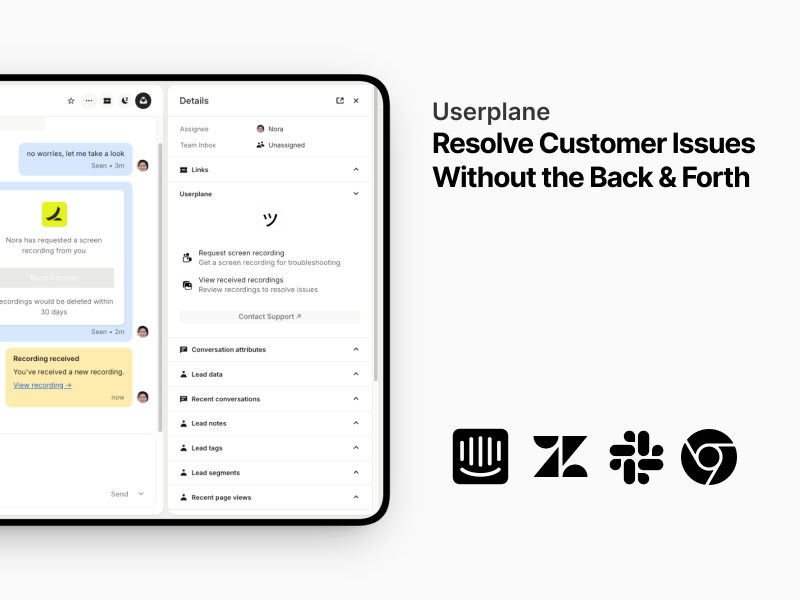 Userplane helps support teams request screen recordings that automatically capture logs, network activity, and user s...