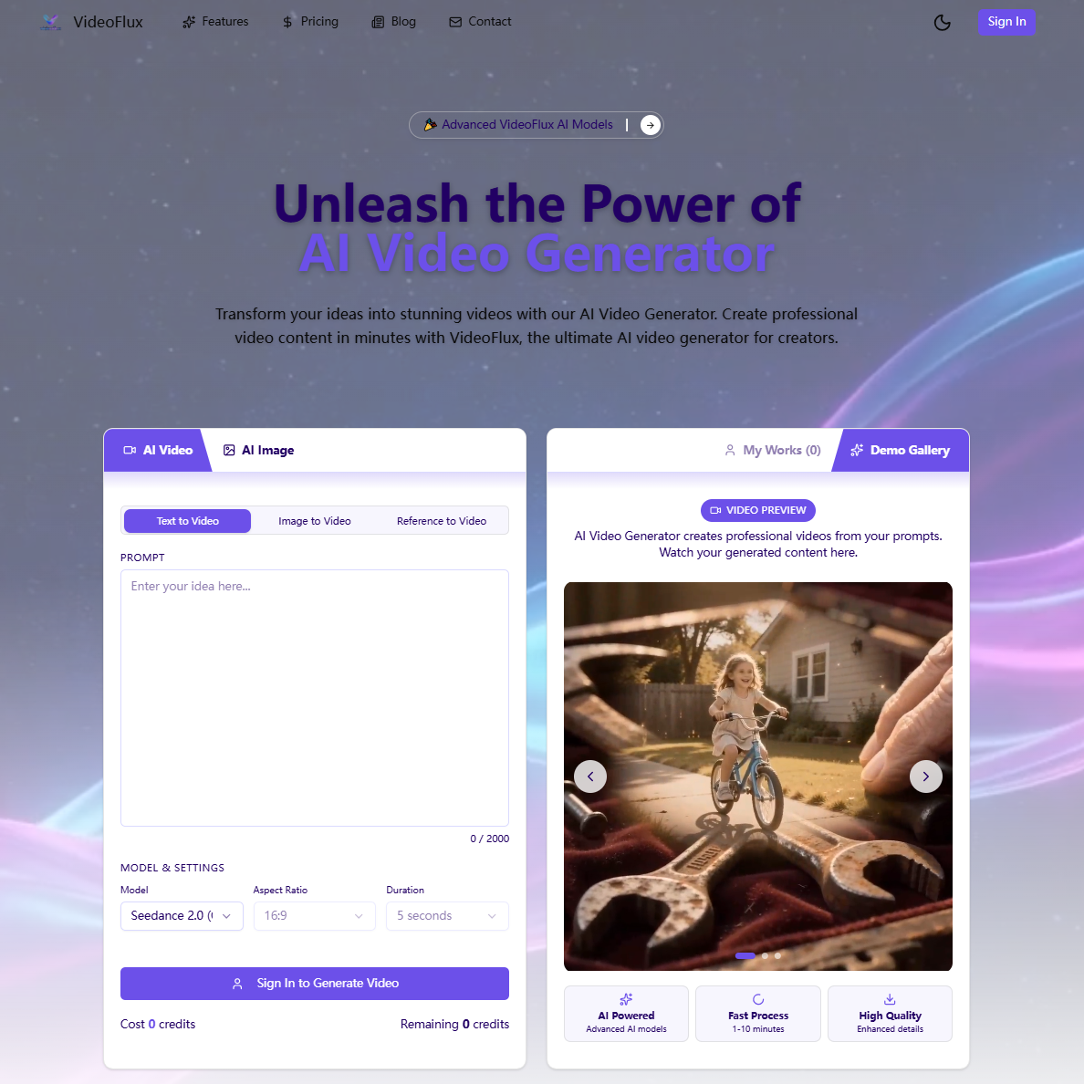 VideoFlux is an AI-powered video generation tool that converts text prompts and images into professional-quality videos. It supports text-to-video, image-to-video, and image-to-image creation, allowing users to produce marketing videos, social content, ads, and creative visuals quickly. The platform offers flexible input options, style customization, fast generation, and an easy workflow for creating and managing projects. VideoFlux is designed for creators, marketers, and businesses looking for