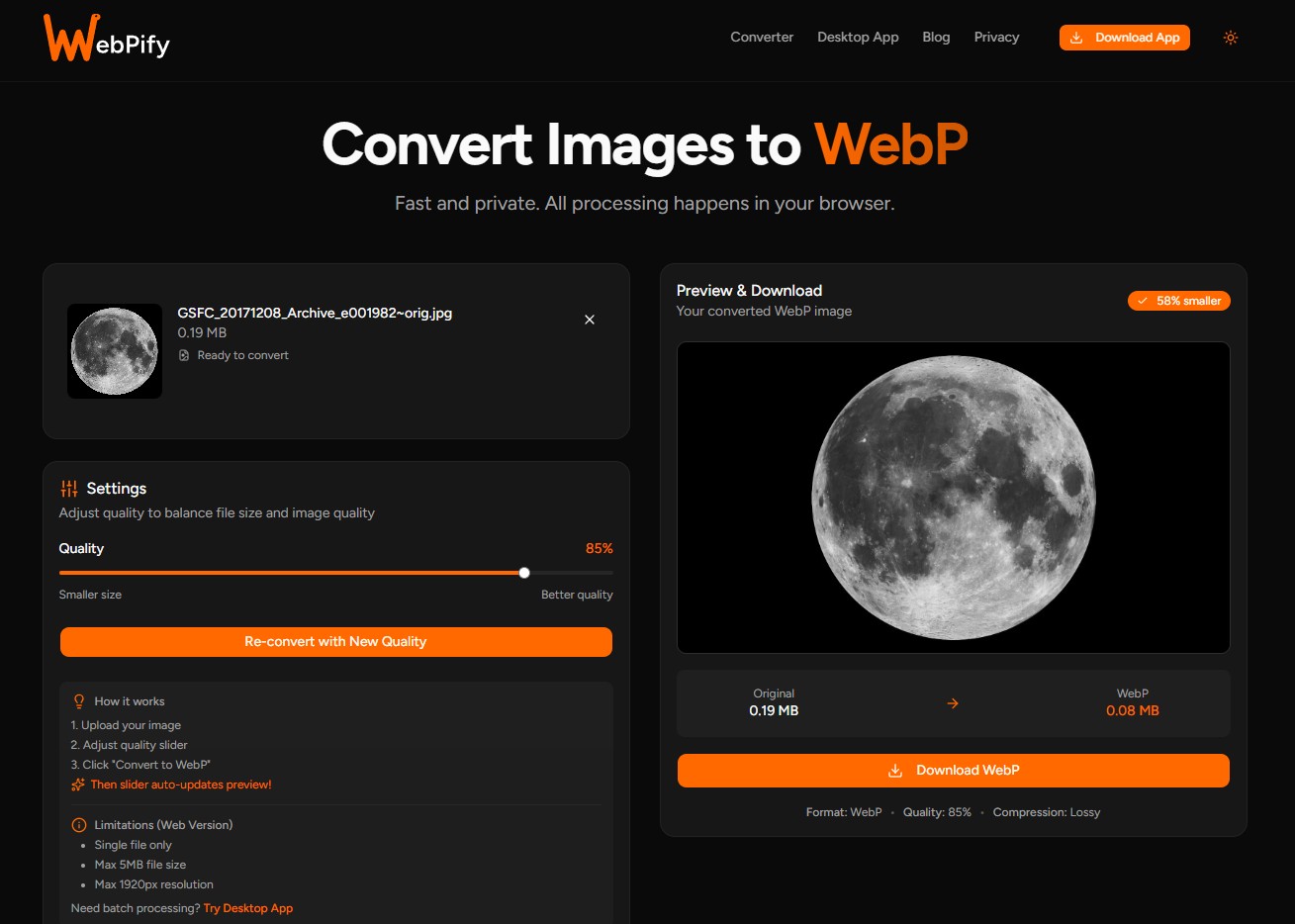 Free WebP image converter that works 100% client-side in the browser. No uploads, no servers — files never leave your device. Built with Next.js and WebAssembly (libwebp by Google).
